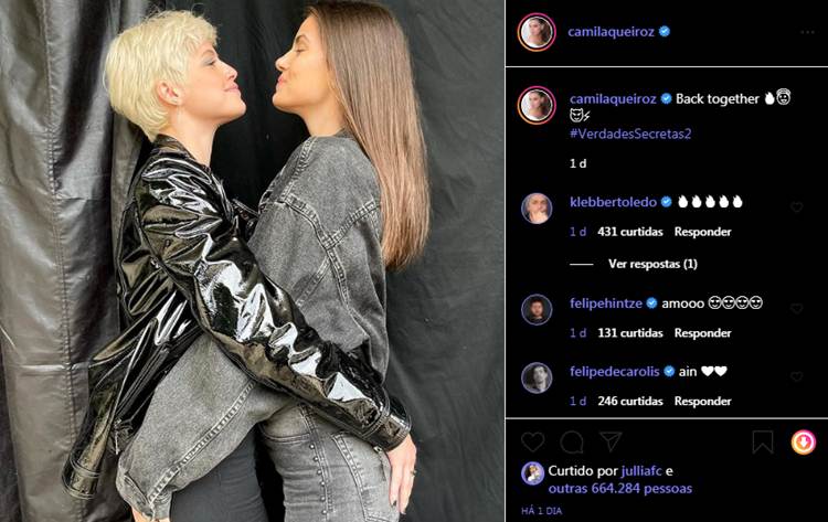 Camilla Queiroz está no elenco de ‘Verdades Secretas 2’. Na segunda-feira (24), a atriz que estreou na TV na novela no papel de Angel, mostrou o reencontro com Agatha Moreira, que também retorna à trama como Giovanna. “Juntas novamente”, escreveu.