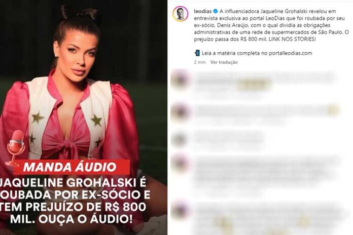 A informação foi revelada pela influenciadora em áudio enviado ao portal Leo Dias. Segundo Jaque, ela iniciou um projeto de um mercado que tinha três sócios. Durante o empreendimento, descobriu que algumas coisas estavam “passando batidas”.