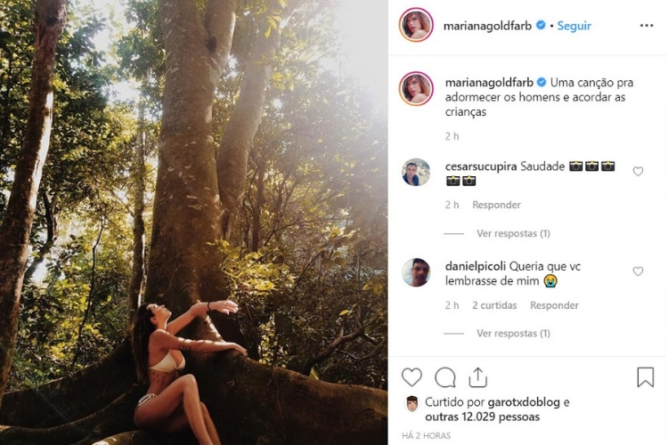 Em seu Instagram, Mariana Goldfarb publicou uma foto em que aparece no meio da natureza exibindo uma boa forma exuberante. Na legenda, ela aproveitou para dar aquela filosofada e deixar uma mensagem enigmática para os seguidores: “Uma canção pra adormecer os homens e acordar as crianças”, escreveu a gata.