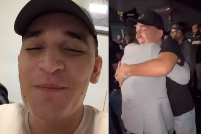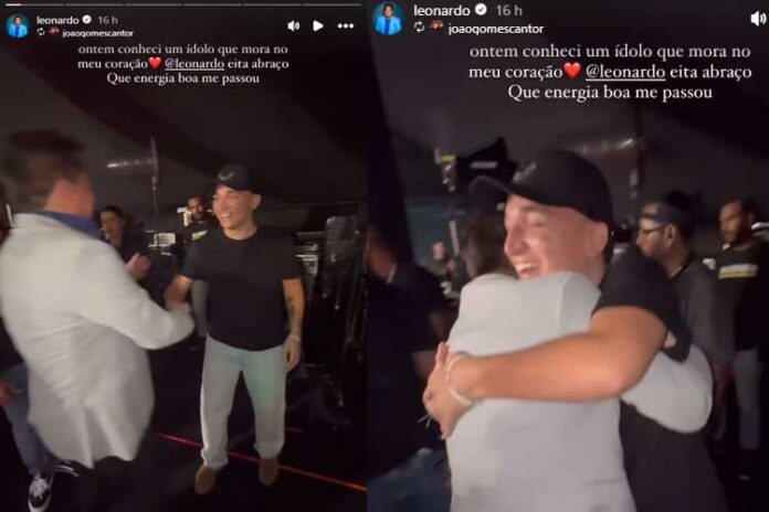 João e Leonardo se abraçam, enquanto o artista destaca o quanto o momento foi significativo. “Ontem conheci um ídolo que mora no meu coração. Leonardo, eita abraço! Que energia boa me passou”, afirmou João ao descrever o encontro.
