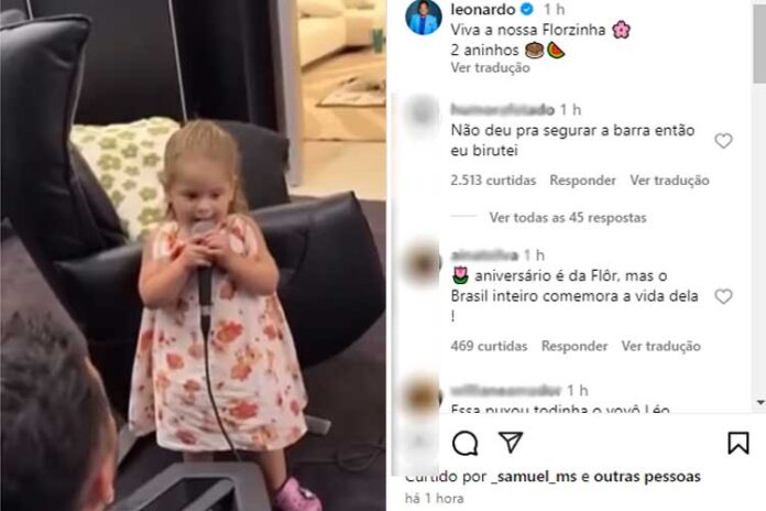 Nele, é possível ver a aniversariante cantando [ou pelo menos tentando] uma das canções do cantor, que fazia dupla com Leandro. Leonardo ainda aproveitou para celebrar mais um ano de vida da herdeira de Virginia Fonseca e Zé Felipe. “Viva nossa Florzinha. 2 aninhos”, escreveu na legenda.