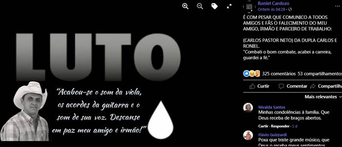 Amigo e companheiro dos palcos de Carlos, Roniel Cardozo publicou uma homenagem nas redes sociais. “É com pesar que comunico a todos os amigos e fãs, o falecimento do meu amigo, irmão e parceiro de trabalho”, escreveu.