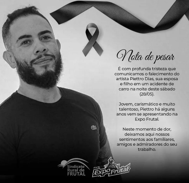 Além disso, por meio das redes sociais, o perfil oficial da Expo Frutal, evento o qual o sertanejo participaria entre os dias 26 de junho e 3 de julho, lamentou o acidente e a perda do artista. “Jovem, carismático e muito talentoso, Piettro há alguns anos vem se apresentando na Expo Frutal. Neste momento de dor, deixamos aqui nossos sentimentos aos familiares, amigos e admiradores do seu trabalho”, pontuaram. Os prefeitos de ambas cidades da fatalidade, também lamentaram o acidente trágico.