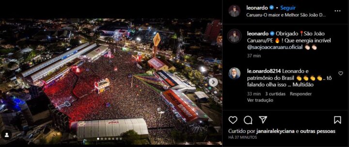 Na legenda das imagens, o pai de Zé Felipe agradeceu pelo momento e relatou que a energia do lugar é incrível. O homem disse o seguinte: ”Obrigado São João Caruaru/PE ! Que energia incrível @saojoaocaruaru.oficial”, enfatizou. E é claro que os internautas não poderiam deixar este momento passar como despercebido. Rapidamente trataram de comentar na publicação de Leonardo.