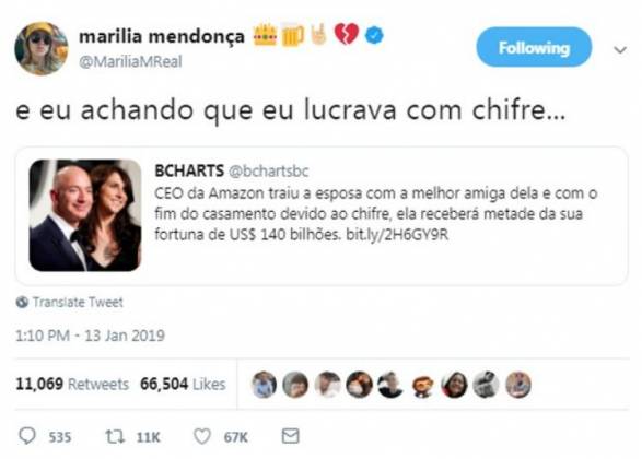 A cantora sertaneja Marília Mendonça, brincou em seu perfil no Twitter, em relação a separação do empresário norte-americano Jeff Bezos, com Mackenzie Bezos, após 25 anos de casamento.