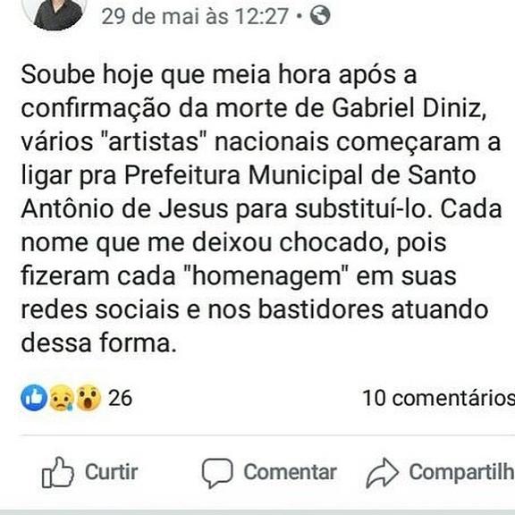 “Soube hoje que meia hora após a confirmação da morte de Gabriel Diniz, vários “artistas” nacionais começaram a ligar para Prefeitura Municipal de Santo Antônio de Jesus para substituí-lo. Cada nome que me deixou chocado, pois fizeram cada “homenagem” em suas redes sociais e nos bastidores atuando dessa forma”, dizia a publicação do fã.