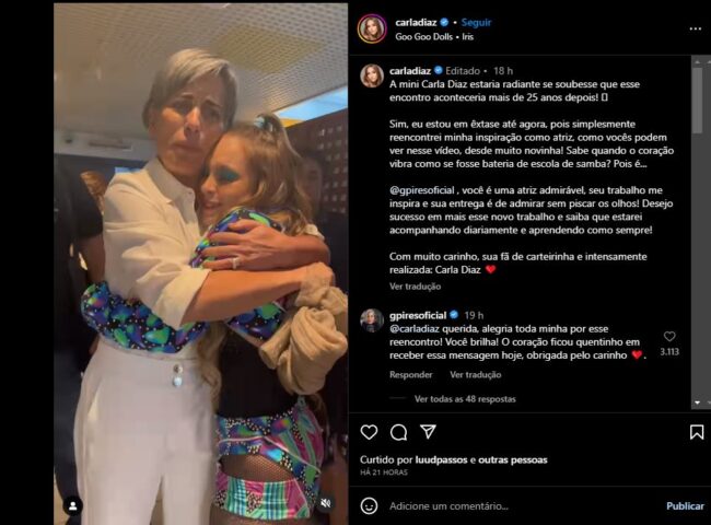 Recentemente, através de sua conta oficial do Instagram, a artista compartilhou o vídeo do momento no qual aparece chorando e se encontrando com Gloria. Na legenda, em tom de emoção, ela fala sobre o encontro com a atriz: ”A mini Carla Diaz estaria radiante se soubesse que esse encontro aconteceria mais de 25 anos depois!”.