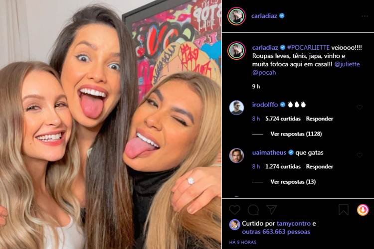 No feed do Instagram, Carla publicou uma foto do trio. “#POCARLIETTE veioooo!!!! Roupas leves, tênis, japa, vinho e muita fofoca aqui em casa!!! @juliette @pocah”, escreveu na legenda.