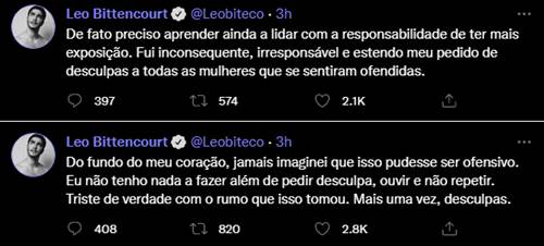 Em seguida, ele disse que precisava aprender a lidar com as redes sociais. “De fato preciso aprender ainda a lidar com a responsabilidade de ter mais exposição. Fui inconsequente, irresponsável e estendo meu pedido de desculpas a todas as mulheres que se sentiram ofendidas”, escreveu.