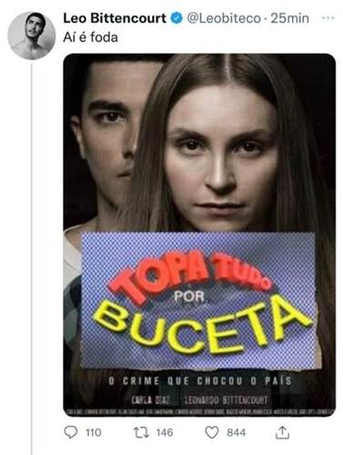 Tudo começou quando Leo compartilhou uma montagem do poster do filme com o título alterado para ‘Topa Tudo por B*ceta’, com a legenda “Aí é f*da”. A ex-BBB usou seu perfil nas redes sociais para registrar seu incômodo com a piada. O ator até apagou a publicação, que já havia viralizado no microblog.