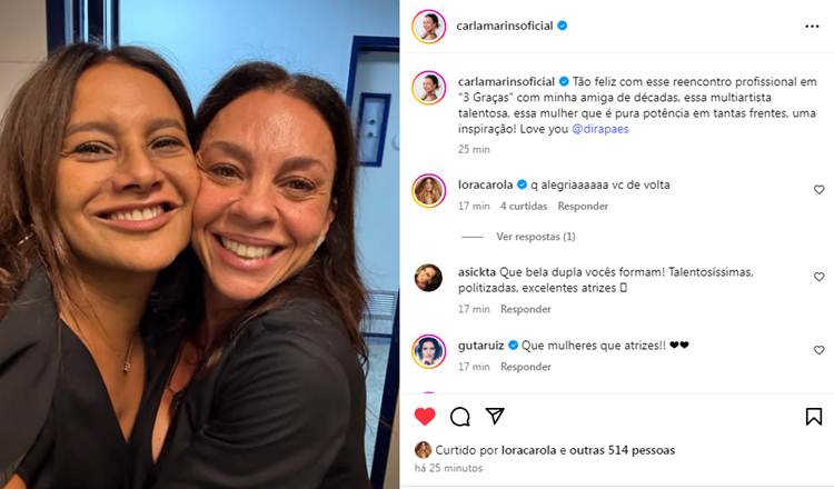 Em seu perfil oficial no Instagram, Carla publicou um registro ao lado da colega de trabalho. “Tão feliz com esse reencontro profissional em “3 Graças” com minha amiga de décadas, essa multiartista talentosa, essa mulher que é pura potência em tantas frentes, uma inspiração! Love you @dirapaes”, declarou Marins.