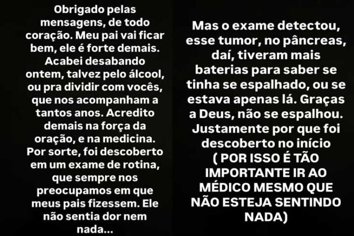 De acordo com Carlinhos, o pai está com um tumor no pâncreas, diagnosticado após a realização de um exame de rotina. “Obrigado pelas mensagens, de todo coração. Meu pai vai ficar bem, ele é forte demais. Acabei desabando ontem, talvez pelo álcool, ou para dividir com vocês, que nos acompanham há tantos anos”, iniciou.