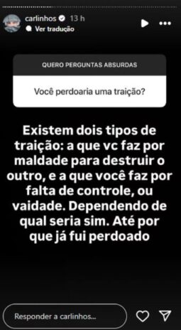 Vale lembrar, que Carlinhos vive um relacionamento com Lucas Guimarães há 15 anos. Eles se conheceram na adolescência e se casaram em 2019. Ele, no entanto, não deixou claro se foi o marido que o perdoou ou se o perdão veio de uma outra relação do passado.