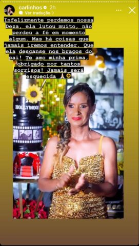 “Infelizmente perdemos nossa Deza, ela lutou muito, não perdeu a fé em momento algum, mas há coisas na vida que jamais iremos entender. Que ela descanse nos braços do pai! Te amo, minha prima, obrigado por tantos sorrisos. Jamais será esquecida. Sempre fomos muito bons juntos. A gente ria de verdade e você me olhava com muito amor. Te amo prima. Até quando Deus quiser”, escreveu.