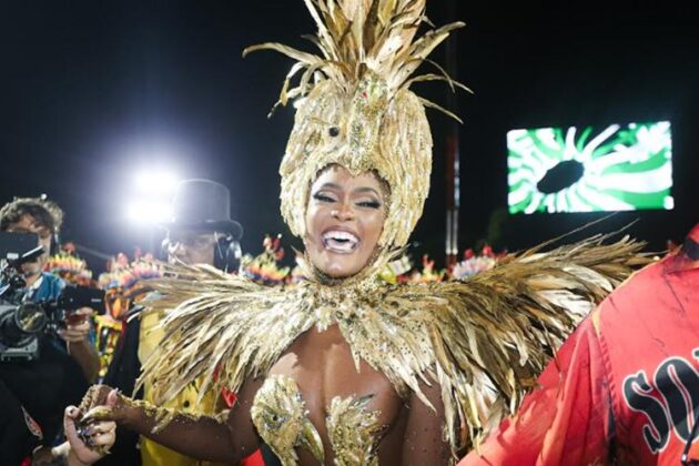 ENCANTOU! Erika Januza impressionou na Sapucaí pela quarta vez como rainha de bateria da Viradouro neste último domingo, 02 de março. A atriz surpreendeu à todos ao surgir fantasiada da ave Carcará e, para deixar o visual ainda mais completo e cinematográfico, ela surgiu toda dourada e trazendo um efeito especial que libera uma fumaça branca.
