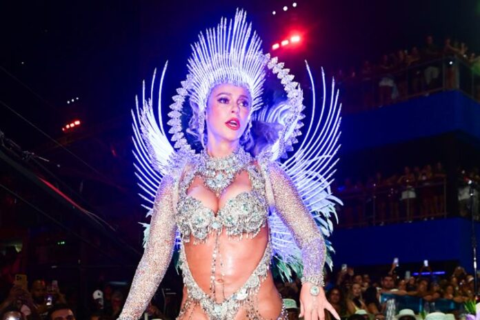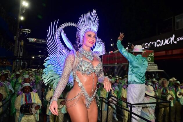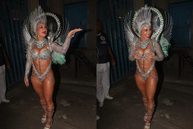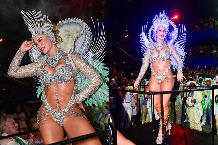 Em seu último desfile como rainha de batéria da Grande Rio, Paolla estava fantasiada de ‘Lua Encantada’, representando a força feminina que move os oceanos, com direito a lead azul fluorescente.
