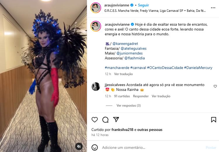 Nas redes sociais, a artista ainda chegou a publicar: “Hoje é dia de exaltar essa terra de encantos, cores e axé! O canto dessa cidade ecoa forte, levando nossa energia e nossa história para o mundo“, publicou ela. “Minha fantasia é muito icônica, porque ela representa o ‘Canto da Cidade’. É em homenagem a Daniela, né? Uma grande estrela da música baiana. Eu quis fazer essa releitura“, ainda informou a musa da Mancha Verde.