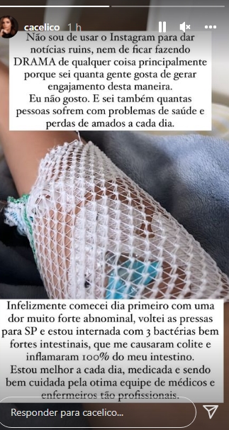 “Infelizmente comecei dia primeiro com uma dor muito forte abdominal, voltei às pressas para SP e estou internada com três bactérias bem fortes intestinais, que me causaram colite e inflamaram 100% do meu intestino. Estou melhor a cada dia, medicada e sendo bem cuidada pela ótima”