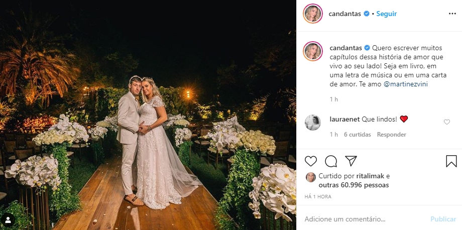 No Instagram de Carol ela escreveu: “Quero escrever muitos capítulos dessa história de amor que vivo ao seu lado! Seja em livro, em uma letra de música ou em uma carta de amor. Te amo, @martinezvini”, legendou Carol.