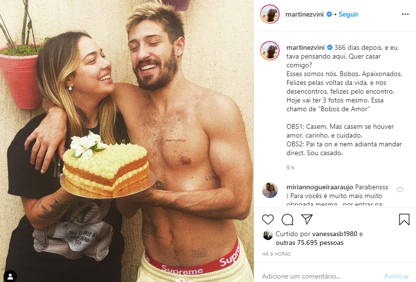 Na noite desta segunda-feira(8), os pombinhos comemoraram 1 ano de casados, e aproveitaram a web para trocarem declarações. Nos seus perfis do Instagram, eles fizeram declarações de amor, com um bolo na mão os dois tiraram fotos juntinhos e aos beijos. Vinícius Martinez utilizou seu Instagram oficial para compartilhar alguns cliques em que o maridão surge aos beijos com a amada.