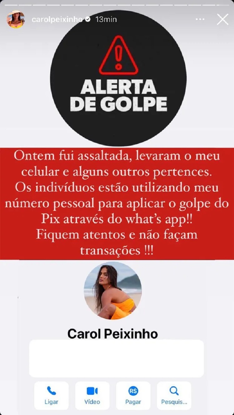 A influenciadora Carol Peixinho usou os Stories do Instagram, neste domingo (4), para emitir um alerta. Ela comunicou aos seguidores que foi vítima de assalto, e que estão utilizando o número dela para aplicar golpes. A namorada de Thiaguinho ainda fez um apelo para a web.
