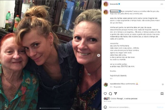 A artista começou relembrando a morte de sua mãe e anunciou o falecimento de sua avó: “Hoje completam 5 anos que a minha mãe foi pro céu. Hoje, vou ver pela última vez a minha avó. Esse dia, que tantas vezes pensei como seria. Nunca imaginei ele assim. A vida surpreende o tempo todo. Não existe plano maior do que o de Deus”, iniciou Carolina no feed de seu Instagram.