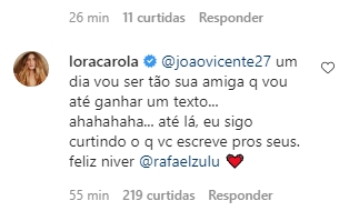 Ela postou na sequência do textão que o ator prestou a Rafael Zulu, e no comentário além de parabenizar o famoso, ela revelou que deseja muito ser amiga de João Vicente, só para poder receber um belo texto de aniversário.
