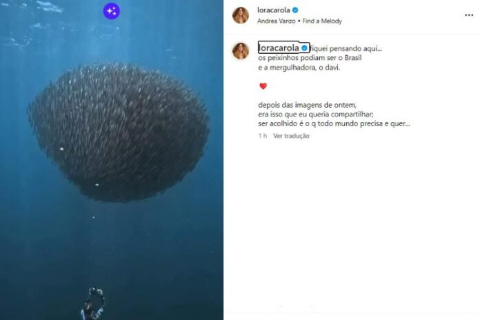No feed do Instagram, Dieckmann postou uma reflexão sobre um cardume de peixes acolhendo uma pessoa no mar e citou o motorista por aplicativo: “Fiquei pensando aqui: os peixinhos podiam ser o Brasil e a mergulhadora, o Davi. Depois das imagens de ontem, era isso que eu queria compartilhar; ser acolhido é o q todo mundo precisa e quer”, escreveu a veterana da televisão.