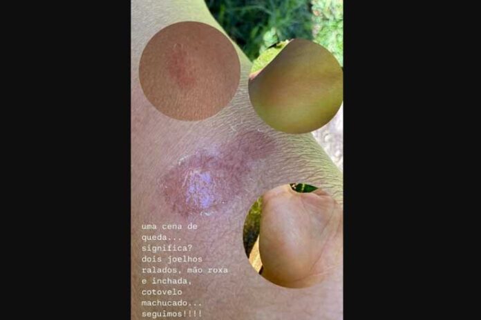Apesar disso, a atriz disse estar bem, continuando com os trabalhos no longa de Rosana Svartman. “Uma cena de queda significa…? Dois joelhos ralados, mão roxa e inchada, cotovelo machucado… Seguimos!”, atualizou a atriz.