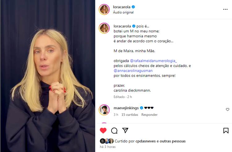 Na noite desta terça-feira (24), a atriz usou as redes sociais para explicar o motivo da mudança após perceber uma certa polêmica em torno do assunto. “Pois é… botei um M no meu nome; porque harmonia mesmo é andar de acordo com o coração… M de Maira, minha mãe”, escreveu Carolina na legenda, revelando que a alteração é também uma homenagem a sua mãe, Maira Dieckmann, que faleceu em 2019.