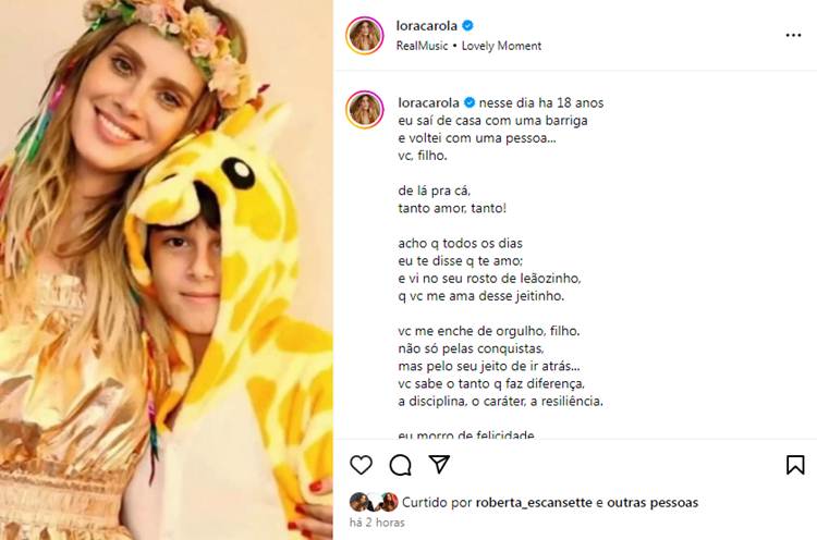 Em seu perfil oficial no Instagram, Carolina publicou uma série de vídeos ao lado do herdeiro para comemorar a data. “Nesse dia, há 18 anos, eu saí de casa com uma barriga e voltei com uma pessoa…Você, filho, de lá pra cá, tanto amor, tanto! Acho que todos os dias eu te disse que te amo; e vi no seu rosto de leãozinho, que você me ama desse jeitinho”, começou.