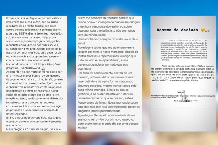 Em momento algum houve a abertura de inquérito acerca de um possível cometimento do crime de racismo e injúria racial em relação a raça, cor ou etnia, e em relação ao tema, confesso ter aprendido muito inclusive durante o programa. Enfim, o inquérito arquivado hoje, investigava o possível cometimento de injúria religiosa da minha parte. Meu coração está cheio de alegria, pois eu e quem me conhece de verdade sabem que nuca hou a intenção de ofensa em relação a nenhum integrante do reality, ou sobre qualquer religião”.