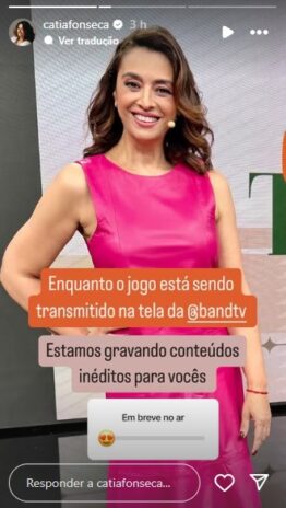 Porém, pelas redes sociais, Catia quebrou o silêncio sobre o assunto e ainda comunicou aos fiéis seguidores uma mega novidade para os próximos dias. “Enquanto o jogo está sendo transmitido na tela da @BandTV. Estamos gravando conteúdos inéditos pra vocês“, disse ela, ao posar com um vestido rosa e bem sorridente nos stories do Instagram. “Em breve no ar“, encerrou. Vale lembrar, que o ‘Melhor da Tarde’ volta ao ar normalmente na quinta-feira, 26 de setembro.