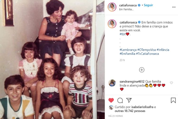 A imagem, inédita, era da infância da apresentadora. Na legenda da publicação, ela fez um desabafo sobre a criança que existe dentro de nós, que não pode ‘morrer’: “Em família com irmãos e primos!!! Não deixe a criança que existe em você”, disse ela, que finalizou o texto com as hashtags: “TBT”, “Lembranças”, “O Tempo Voa”, “Infância”, “Em Família” e “TV Catia Fonseca”, além, claro, de figurinhas de coração. Veja na imagem abaixo separada pela equipe de arte do Área VIP: