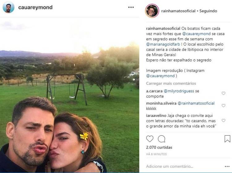“Os boatos ficam cada vez mais fortes que @cauareymond se casa em segredo esse fim de semana com @marianagoldfarb! O local escolhido pelo casal seria a cidade de Ibitipoca, no interior de Minas Gerais! Espero não ter espalhado o segredo”, contou em seu Instagram.