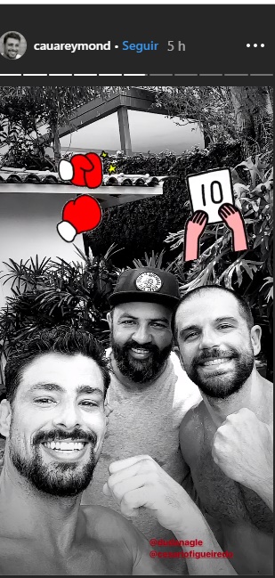 Cauã, surgiu usando as redes sociais, seus stories, e postou uma foto onde os dois artistas aparecem com o punho cerrado, pose clássica do esporte. Vale lembrar que o ator Duda Nagle, atualmente vive o lutador trapaceiro Paixão em “A Dona do Pedaço”, na TV Globo. (foto logo abaixo)