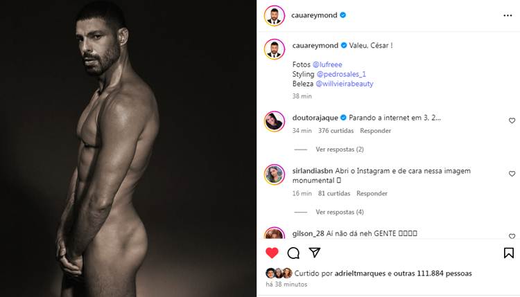 Os seguidores de Cauã logo reagiram nos comentários e quase passaram mal. “Abri o Instagram e de cara nessa imagem monumental”, elogiou um. “TOMANDO MEU REMÉDIO DE PRESSÃO URGENTE”, brincou outro. “Graças a Deus meus exames cardíacos estão todos organizados. Pelo amor de Deus!”, escreveu um terceiro. “Vamos se despedir de César hoje, mas o Cauã é inesquecível”, firmou mais um.