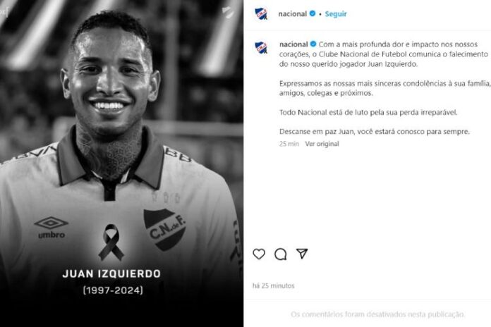 A confirmação da morte viralizou após o Nacional comunicar a triste notícia pelas redes sociais, nesta última terça (27). “Com a mais profunda dor e impacto nos nossos corações, o Clube Nacional de Futebol comunica o falecimento do nosso querido jogador Juan Izquierdo. Expressamos as nossas mais sinceras condolências à sua família, amigos, colegas e próximos. Todo Nacional está de luto pela sua perda irreparável. Descanse em paz Juan, você estará conosco para sempre“, diz o comunicado.