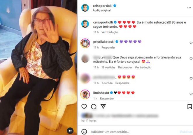 Na legenda da publicação, Portiolli escreveu: “❤️❤️❤️❤️ Ela é muito esforçada!!! 98 anos e segue treinando. ❤️❤️❤️❤️“, destacou o apresentador, enfatizando a força de vontade de sua querida mãe. Nos comentários da postagem, alguns internautas reagiram: “Que Deus siga abençoando e fortalecendo sua mãezinha. Ela é forte e corajosa! 😍🙏🏻“, desejou uma. “Deus abençoe sua rainha com muita saúde, só quem não tem mais é q sabe o valor que perdeu“, comentou outra.