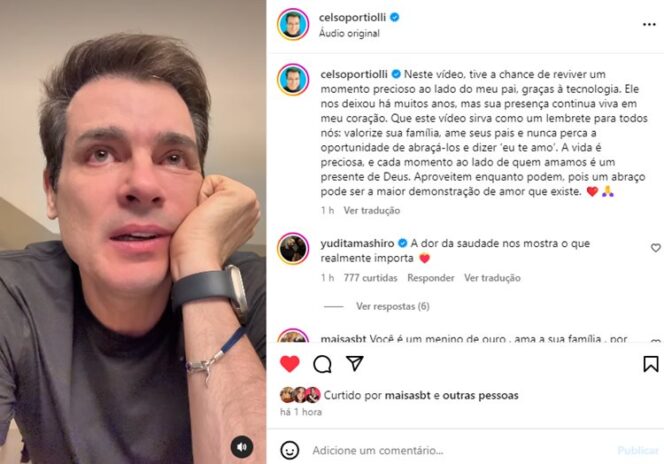 Através do feed no Instagram, Celso Portiolli compartilhou o vídeo onde surge em lágrimas, mostrando o momento que criou com ajuda da IA, escrevendo na legenda: “Neste vídeo, tive a chance de reviver um momento precioso ao lado do meu pai, graças à tecnologia. Ele nos deixou há muitos anos, mas sua presença continua viva em meu coração“, disse ele.