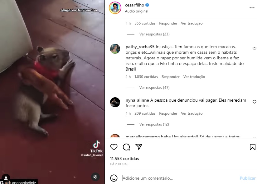 Cesar Filho utilizou o seu Instagram para comentar sobre o caso de Agenor e sua capivara, a Filó. Desse modo, o jornalista acabou gerando um grande número de comentários no post em questão.