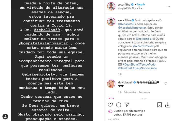 Na semana passada, Cesar Filho usou as redes sociais para contar aos seguidores que testou positivo para a Covid-19. O apresentador contou sobre o diagnóstico e que estava se recuperando em casa.