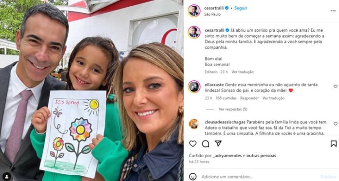 Através do feed no Instagram, o jornalista da TV Globo e comandante do ‘JH’, não se limitou ao falar sobre o que sentia ao iniciar a semana ao lado de seus maiores amores: “Já abriu um sorriso pra quem você ama? Eu me sinto muito bem de começar a semana assim: agradecendo a Deus pela minha família. E agradecendo a você sempre pela companhia“, declarou Cesar Tralli.