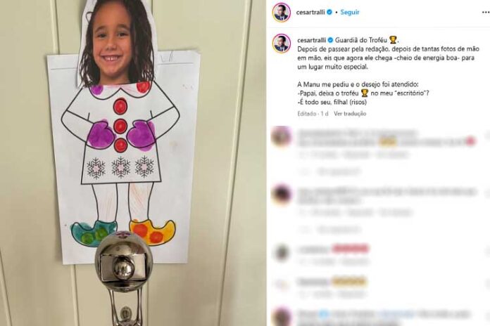 César Tralli decidiu tornar o desejo da filha, Manuella, fruto do seu casamento com Ticiane Pinheiro, em realidade. O jornalista compartilhou em seu perfil nas redes sociais nesta quinta-feira (19), um registro mostrando o destino dado do troféu do “Melhores do Ano”, recebido durante o “Domingão com Huck”.