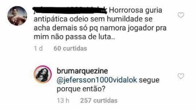 Logo, ela ganhou o apoio de outros internautas: “Arrasou! Até pra responder pessoas hipócritas tem classe. Mulherão”, comentou um seguidor; “Amei a resposta. Melhor pessoa é tu, Bru”, disse outra; “Ele está com inveja do Neymar em todos os sentidos”, escreveu um terceiro.
