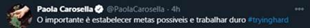 Na manhã deste domingo (10), ela compartilhou uma troca de mensagens com a personal trainer, O importante é estabelecer metas possíveis e trabalhar duro #tryinghard”, disse ela no post no microblog.