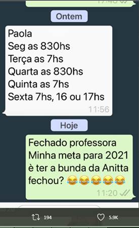 Em seguida ela mostrou a conversa. “Fechado, professora. Minha meta para 2021 é ter a bunda da Anitta, fechou? (risos)”, escreveu ela em resposta aos horários de seus exercícios durante a semana.
