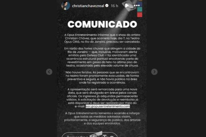 Através das redes sociais, o Opus Entretenimento explicou o motivo da decisão. “A Opus Entretenimento informa que o show do artista Christian Chávez, que ocorreria hoje, dia 7, no Teatro Opus Città, no Rio de Janeiro, precisou ser cancelado. Em razão das fortes chuvas que atingem a cidade do Rio de Janeiro — que, inclusive, motivaram alerta emitido pela Defesa Civil”, explicou o teatro.