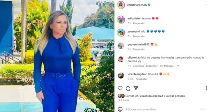 Através do feed no Instagram, Christina Rocha surgiu com um look azul, na porta de entrada dos camarins da emissora, escrevendo na legenda: “Não há nada mais perigoso do que ser feliz diante de um invejoso! Ótima semana 🙏🏻💖“, escreveu a apresentadora, que comandou o ‘Aqui Agora’, ‘Casos de Família’ e o mais recente ‘Tá Na Hora’, no canal.