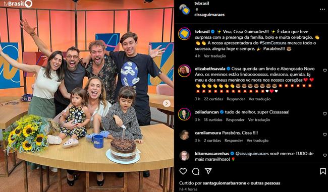 Na situação, integrantes da família da artista se fizeram presentes, onde ela ainda recebeu um bolo e flores. Sendo assim, a equipe da TV Brasil parabenizou Cissa pelos seus 67 anos: ”Viva, Cissa Guimarães! É claro que teve surpresa com a presença da família, bolo e muita celebração. A nossa apresentadora do ‘Sem Censura’ merece todo o sucesso, alegria hoje e sempre. Parabéns”.